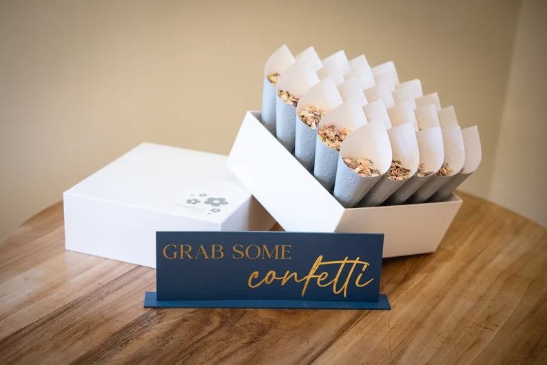 Make your confetti celebration truly unforgettable with our exquisite acrylic confetti sign, designed to add a touch of elegance and playfulness to your wedding day. Crafted from high-quality acrylic, this sign features a range of sophisticated matte colors complemented by vinyl detailing, making it a standout piece for your confetti display.