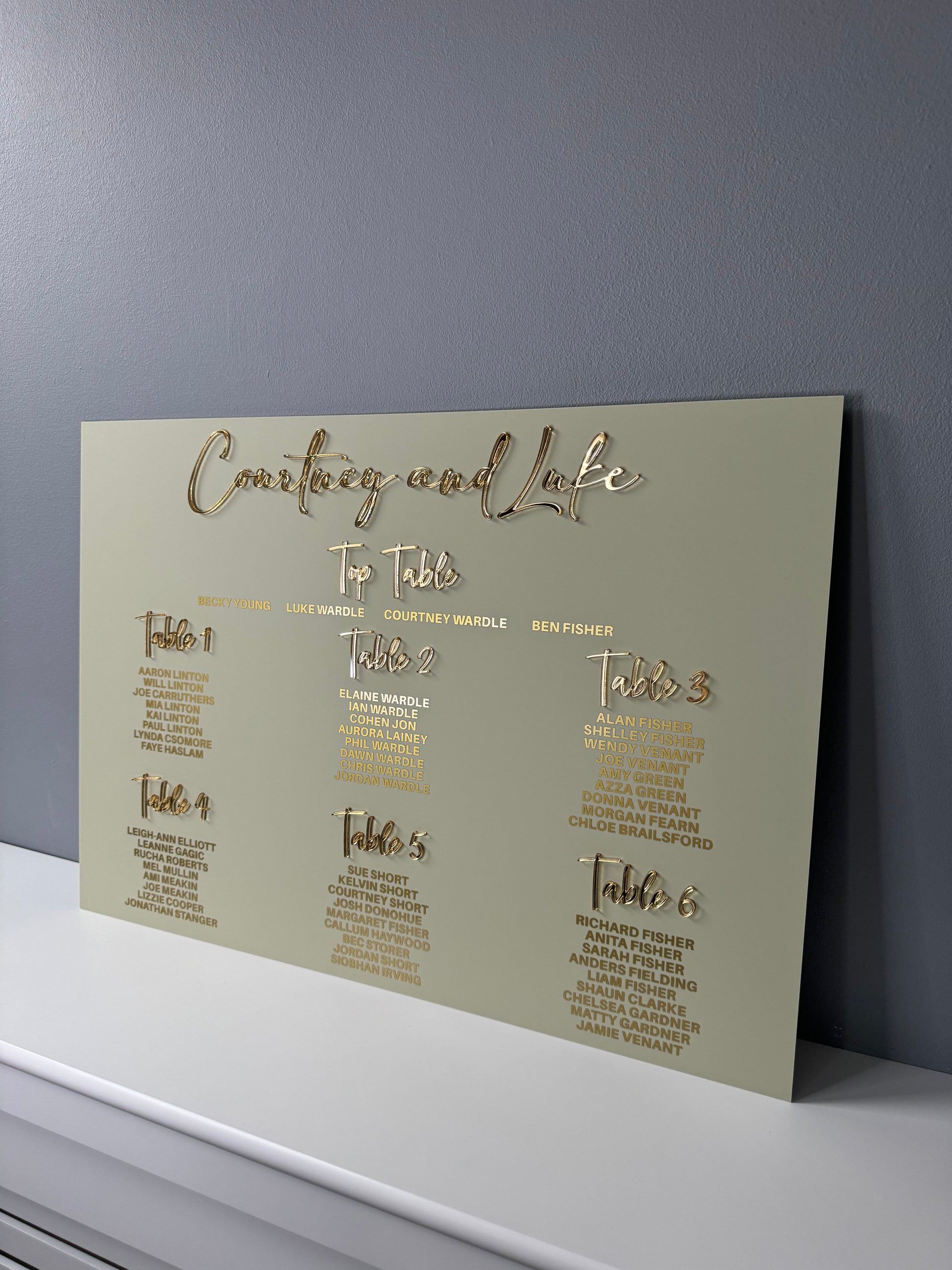 Your names are in acrylic meaning it’s a double acrylic sign. These are finished to a very high standard and are a perfect keepsake from your day.